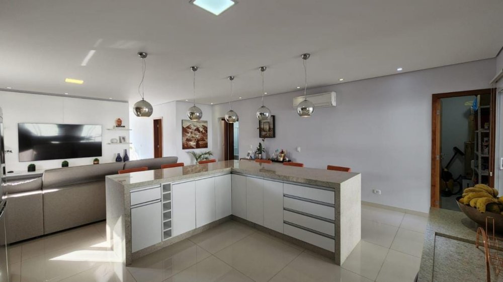 Cozinha Planejada Integrada: A cozinha planejada, integrada à sala de estar e TV, é um espaço gourmet em si mesma, onde a culinária se encontra com o convívio social.