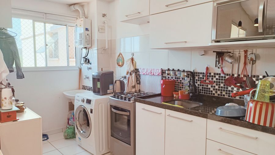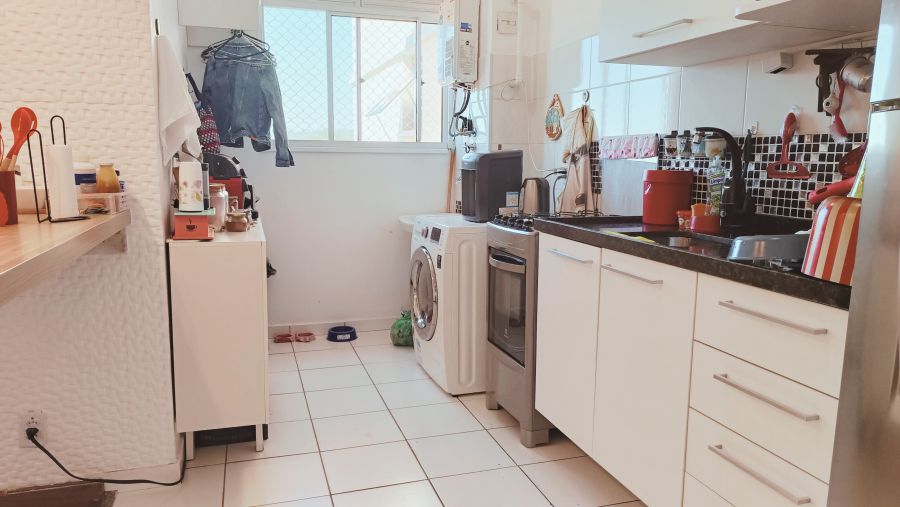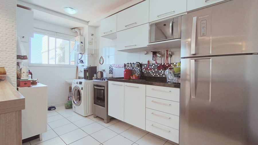 Cozinha Planejada: Cozinha moderna conceito aberto, com armários embutidos e espaço otimizado para garantir praticidade no dia a dia. A área de serviço adjacente é funcional e discreta.