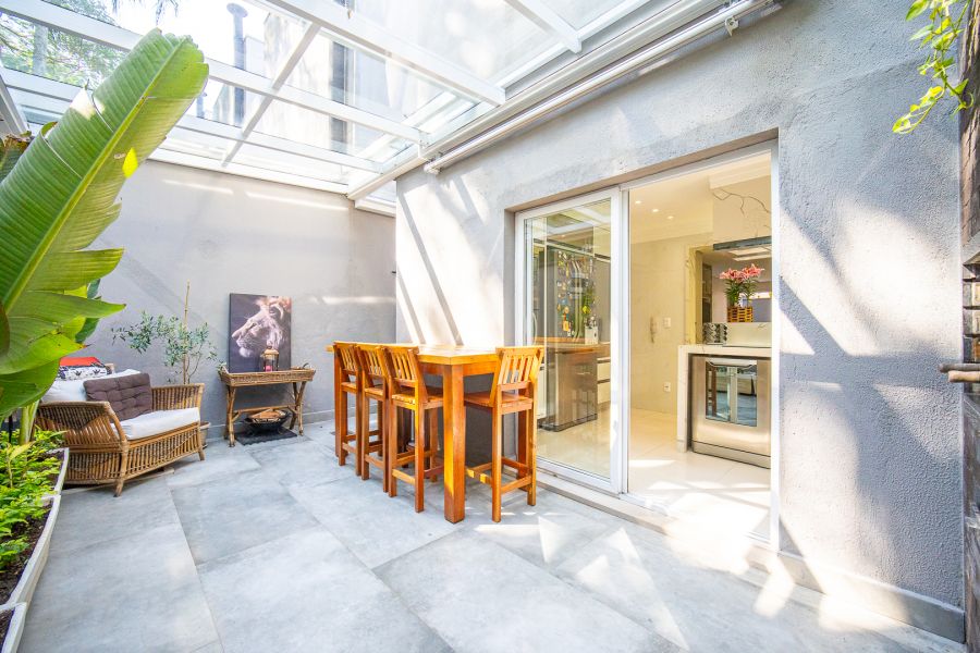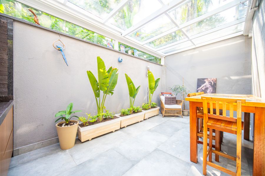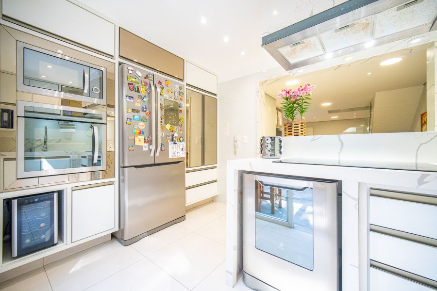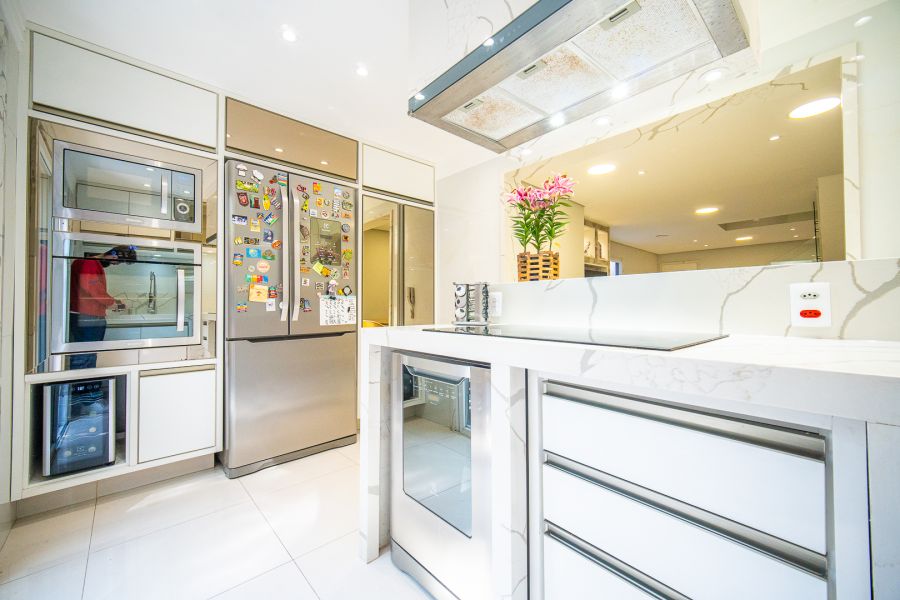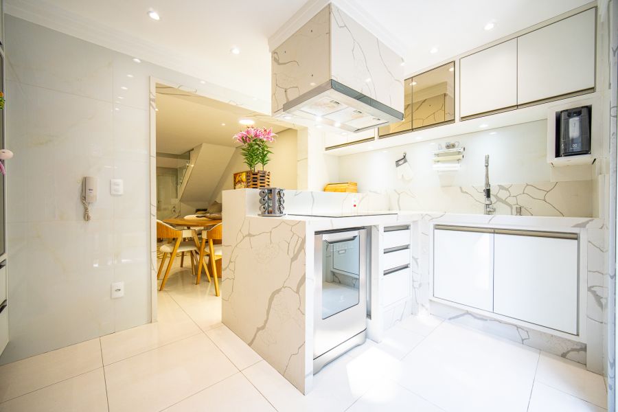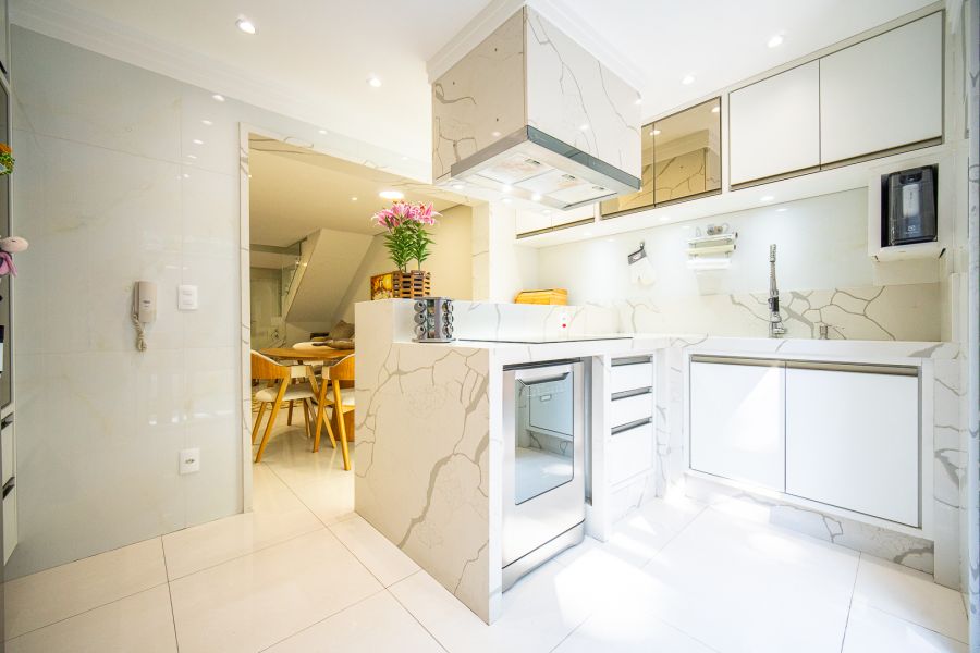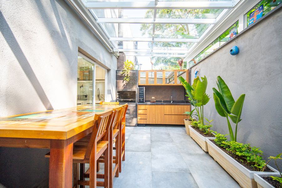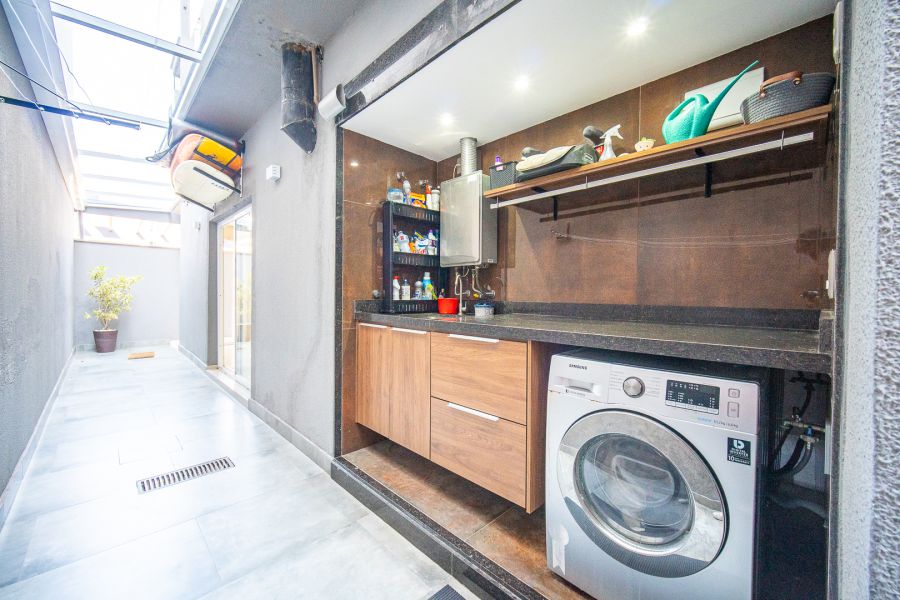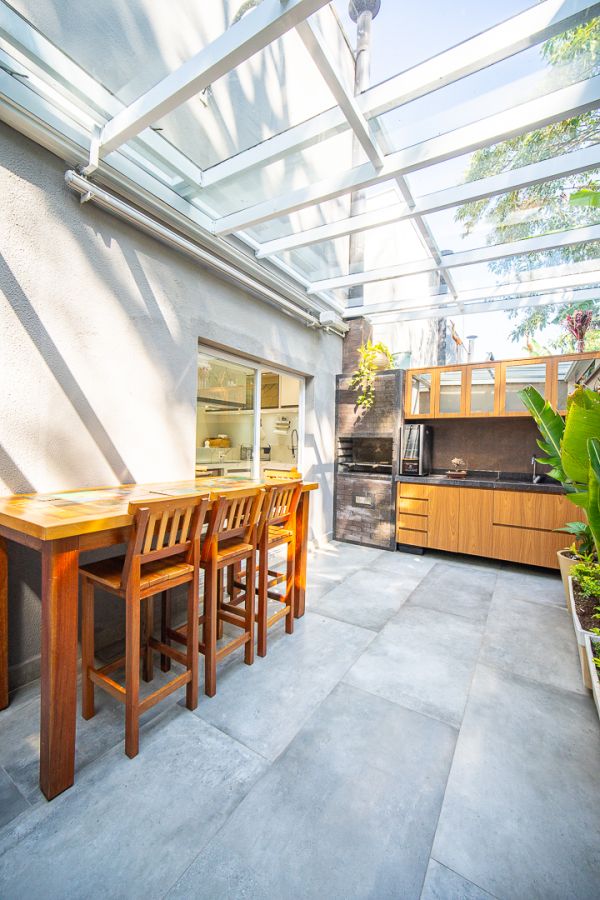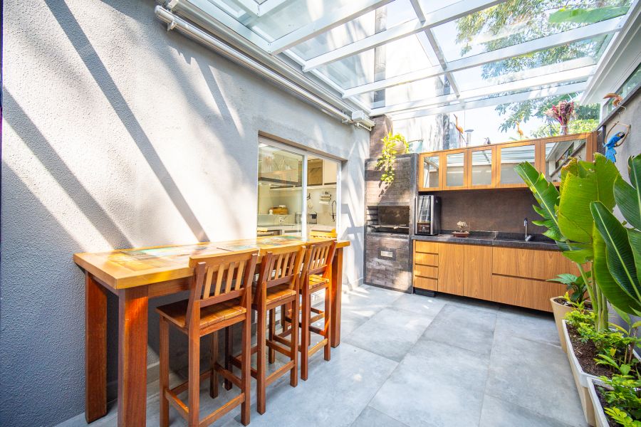 A cozinha integrada à sala possui armários planejados, proporcionando um ambiente funcional e aconchegante. A área gourmet, com armários, é perfeita para momentos em família em qualquer clima.