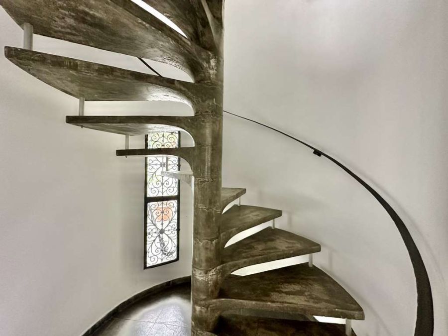 Garagem para 7 vagas, sendo 4 cobertas com escada caracol de concreto direto para cozinha.