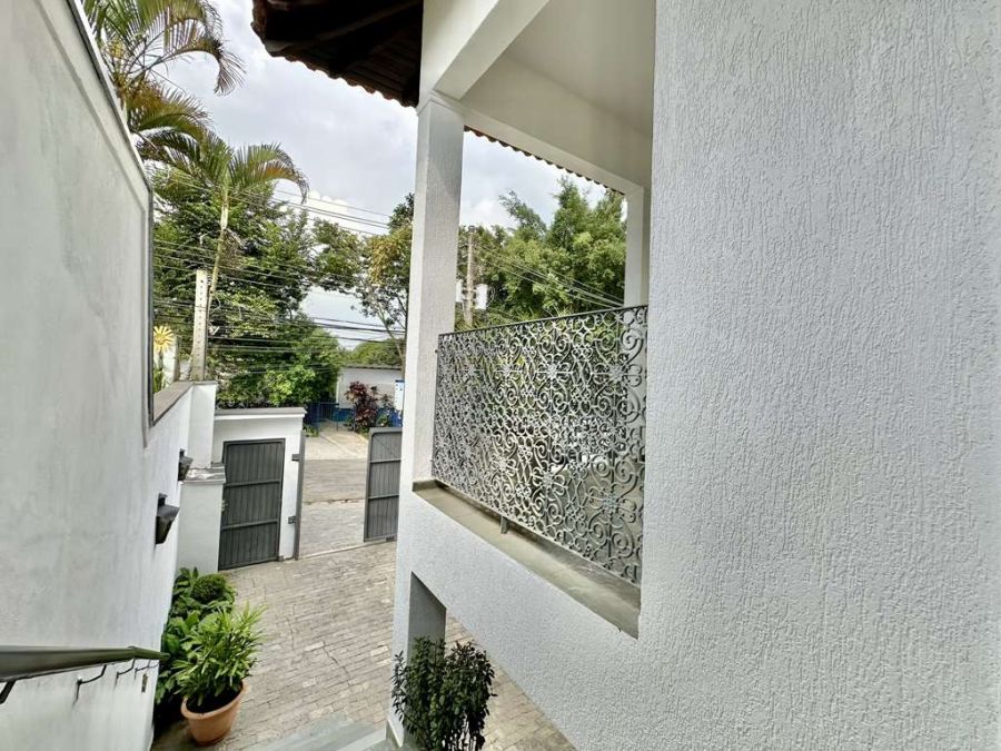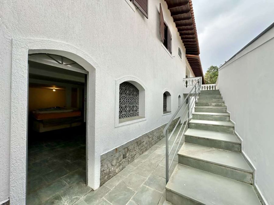 Entrada social por uma escada de alvenaria, revestida em ardósia, com guarda corpo de ferro.