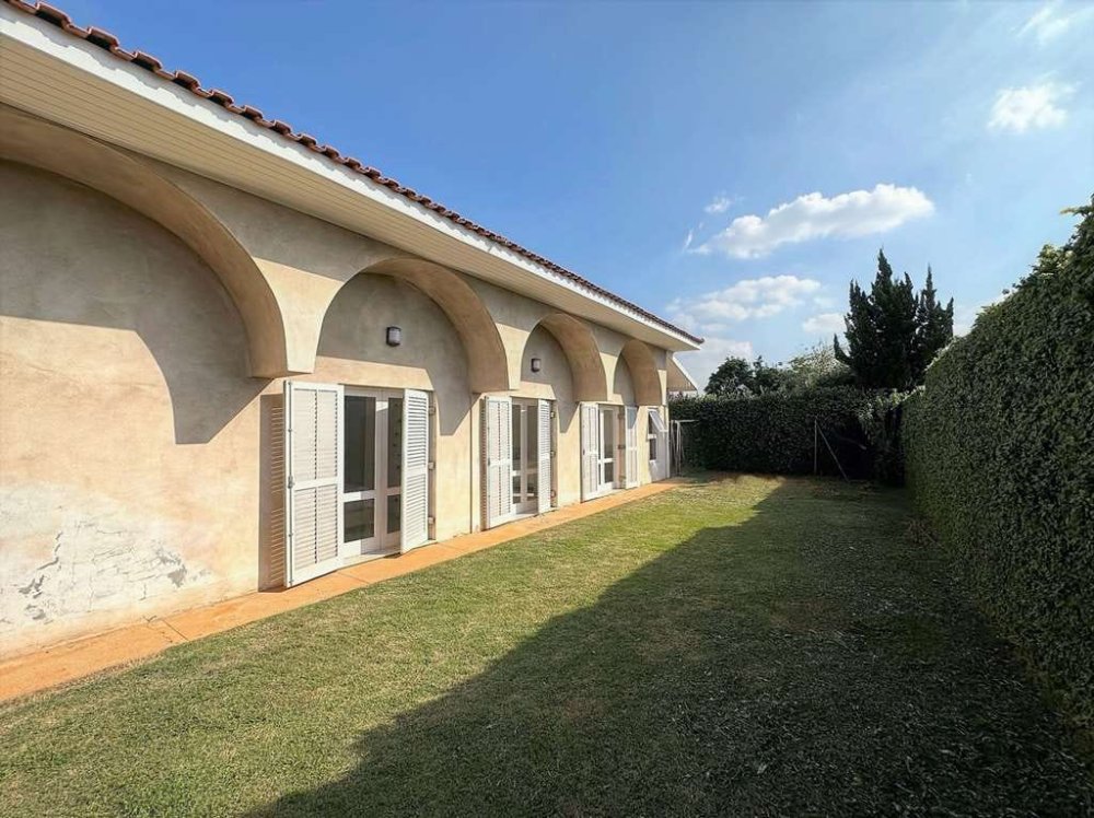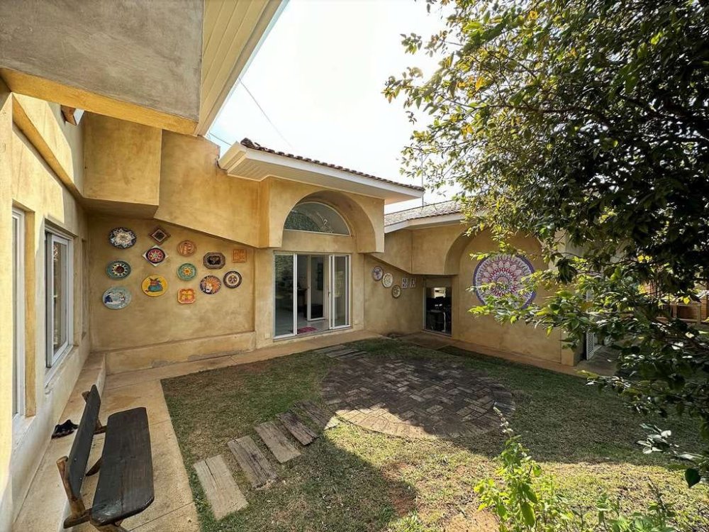 O espaço ao ar livre desta casa é um verdadeiro oásis. O pátio lateral conta com uma jabuticabeira, um convite para momentos de sombra e relaxamento sob um ombrelone, cercado por móveis de jardim que completam a atmosfera tranquila.